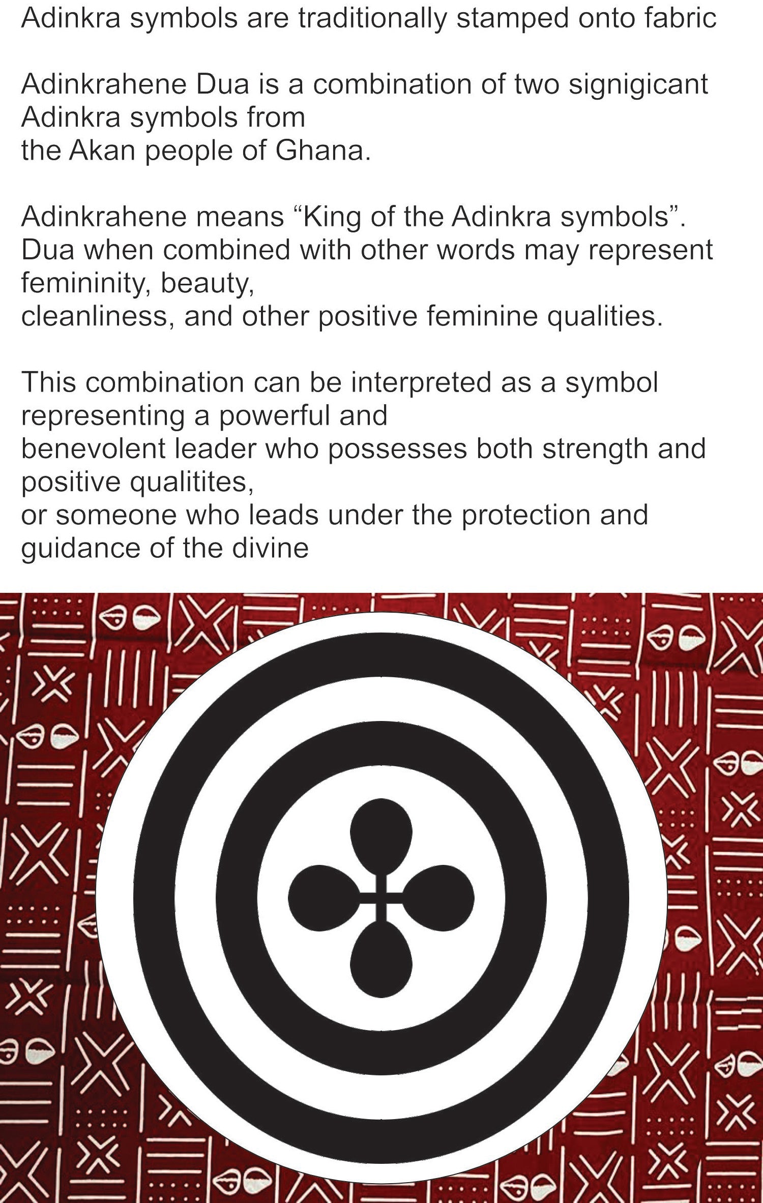 Adinkrahene means “King of the Adinkra symbols.” It is a symbol for authority, leadership, and charisma. Dua when combined with other words may represent femininity, beauty, cleanliness, and other positive feminine qualities.