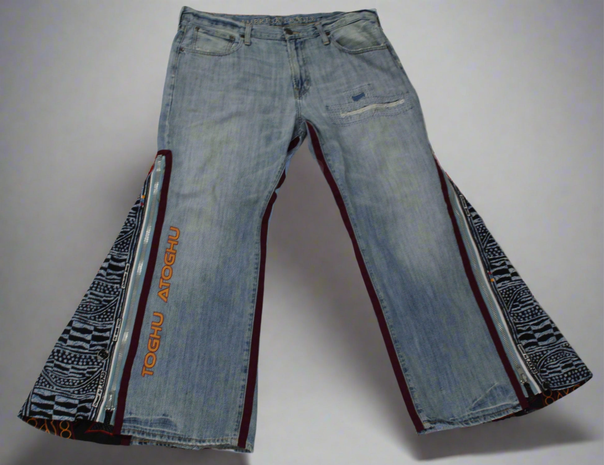 Upcycled American Eagle jeans 38 / 16 Plus Unisex embroidered Cameroon Atoghu Togh & Ankara One-Of-A-Kind African Diaspora