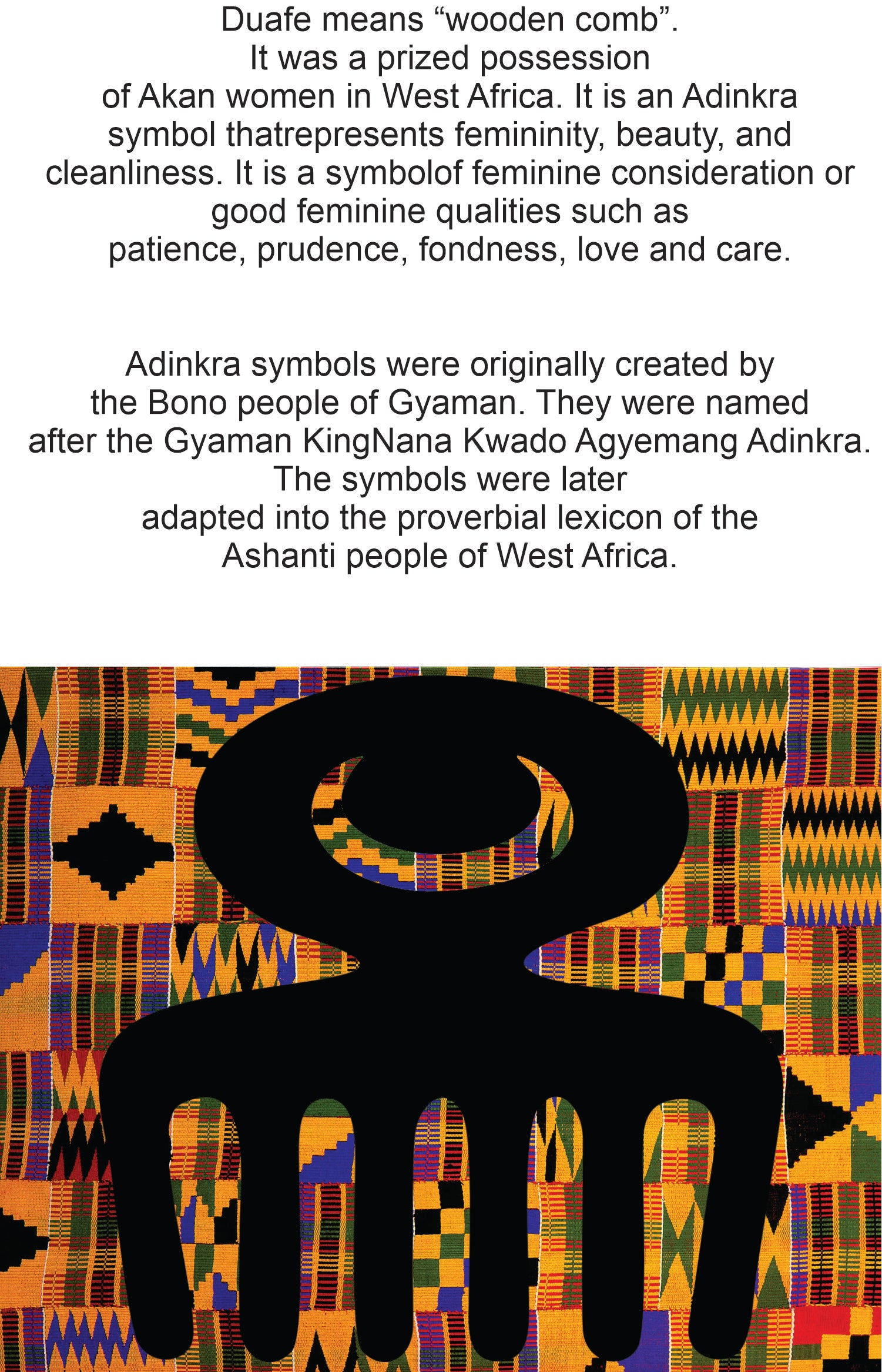 Duafe means “wooden comb”. It was a prized possession of Akan women in West Africa. It is an Adinkra symbol that represents femininity, beauty, and cleanliness. It is a symbol of feminine consideration or good feminine qualities such as patience, prudence, fondness, love, and care.