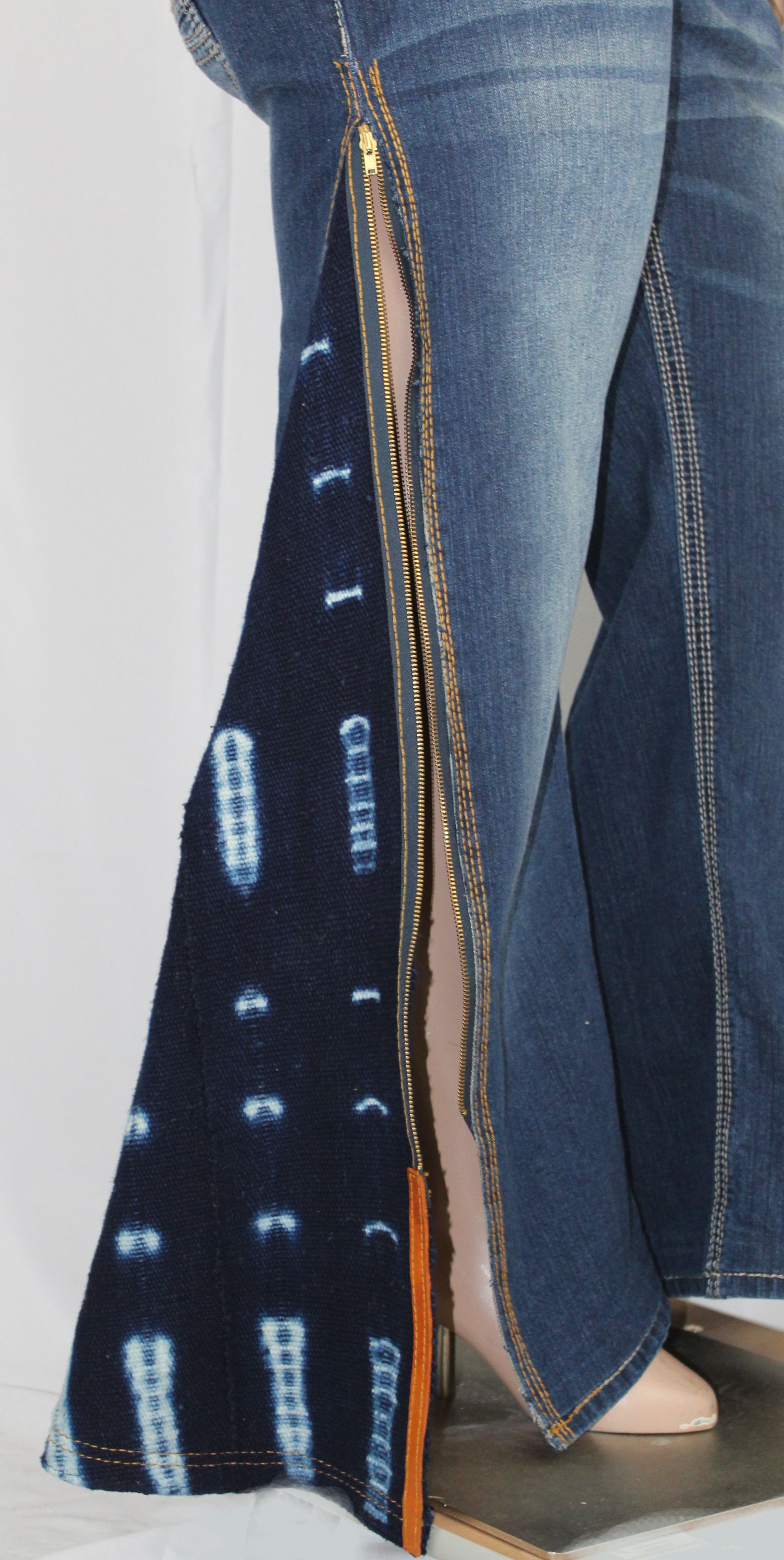 Learning about the meaning of the symbols, the texture, the colors, and the visual beauty of the Indigo African Mud Cloth inspired me to be creative. The symbols adorning the mud cloth represent occupation, status, and wealth, infusing these jeans with a story to tell.