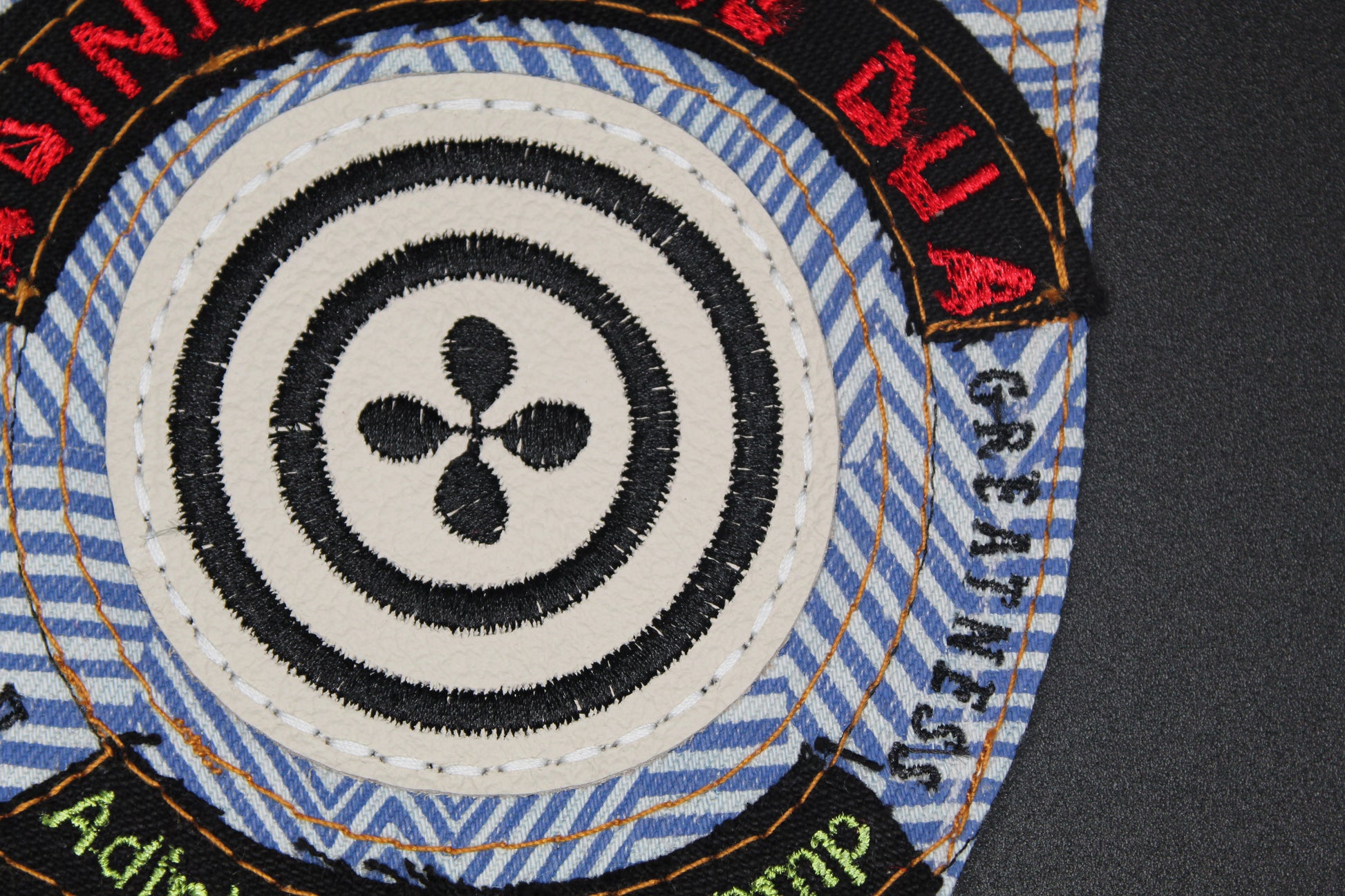 Upcycled from a thrifted jeans back pocket with the symbol embroidered on genuine leather applique and embroidered text on denim scrap appliques.